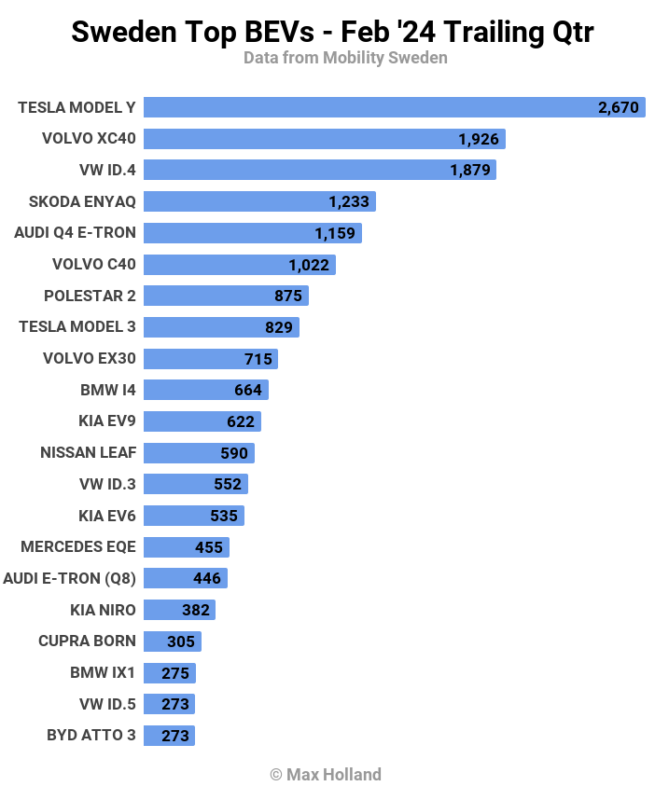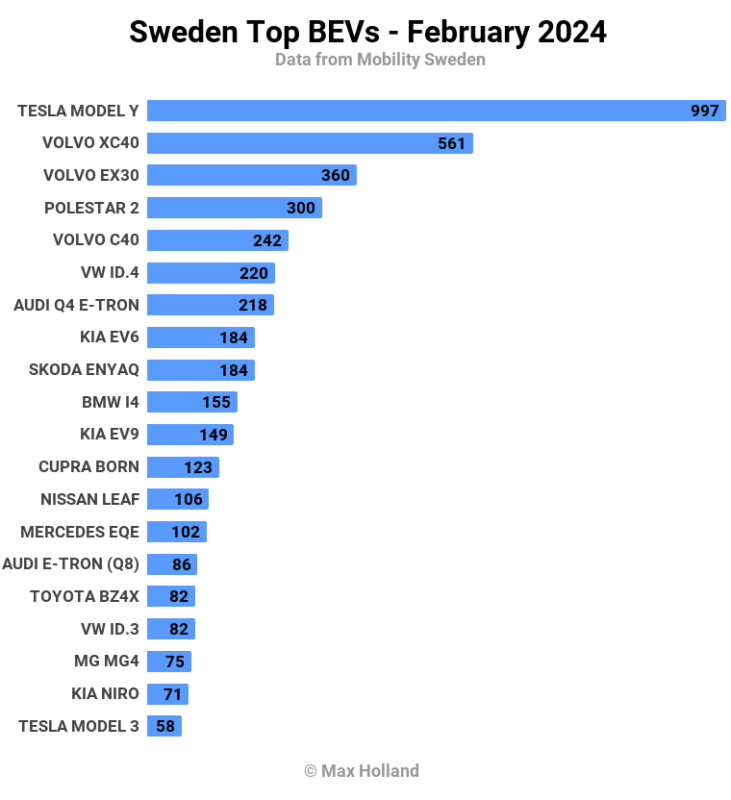 The Tesla Model Y was once again the best selling BEV in February, with 997 units registered. The Volvo XC40 was the runner up with 561 units, and the new Volvo EX30 rose to third, with 360 units.